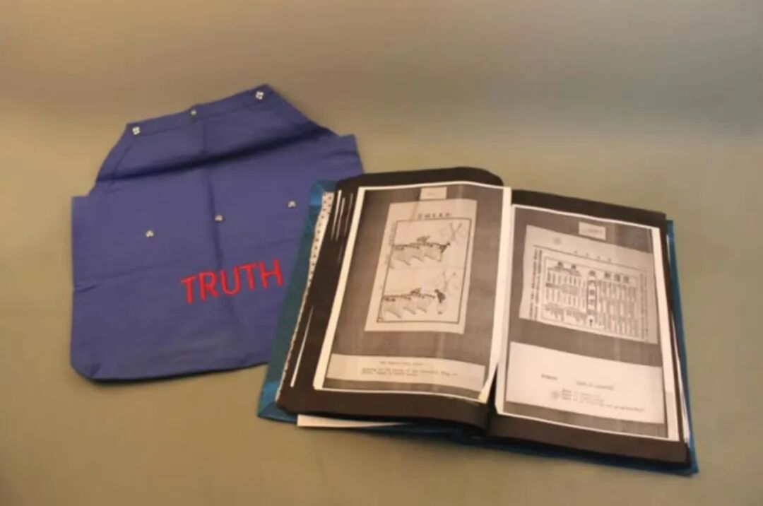 紧挨着相机的,是一个褪色的蓝色布袋,上面用白丝线绣着英文“TRUTH”(真相),针脚细密,能看出缝制时的用心。这就是“九君子”用来装侵华证据的袋子。为了让国际调查团看懂证据,“九君子”把搜集到的300多件材料,如日军的命令、布告、百姓的证言、刘仲明拍的照片等,全部译成英文,装订成册。他们知道,这份材料一旦被日军发现,所有人都会有生命危险。于是,有人负责翻译,有人负责装订,有人负责秘密运送,像传递“接力棒”一样,把袋子安全送到调查团手中。这个小小的蓝布袋,装下的不只是纸页,更是9位普通人面对侵略者时,豁出性命也要守护的正义。