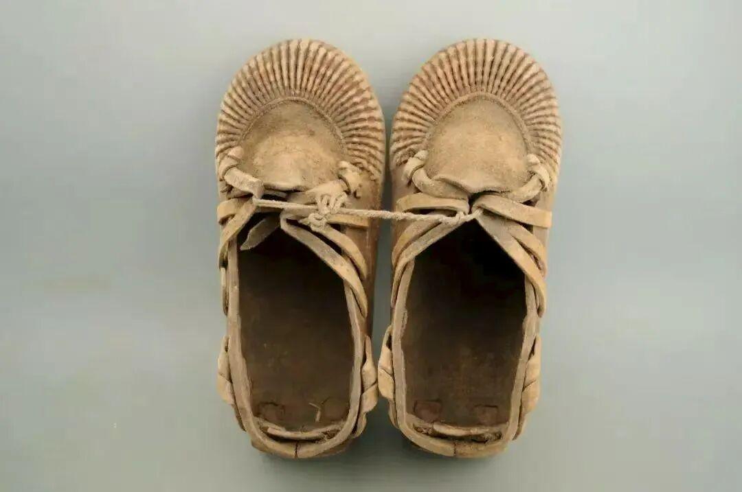 这一双造型特别的牛皮鞋:鞋面有一圈褶子,鞋口串着牛皮带,鞋底厚厚的——这是东北抗联战士冬天穿的靰鞡鞋。