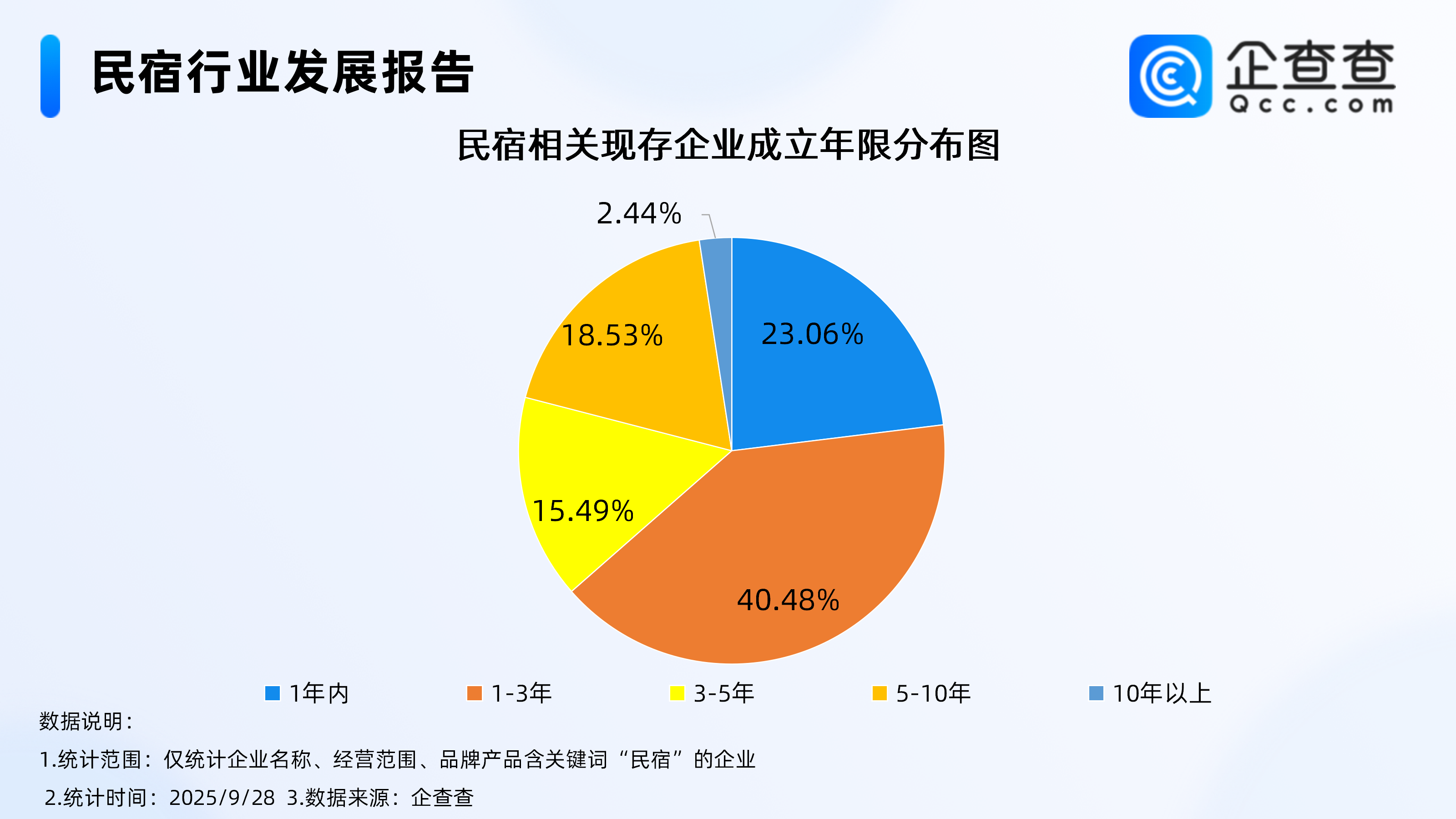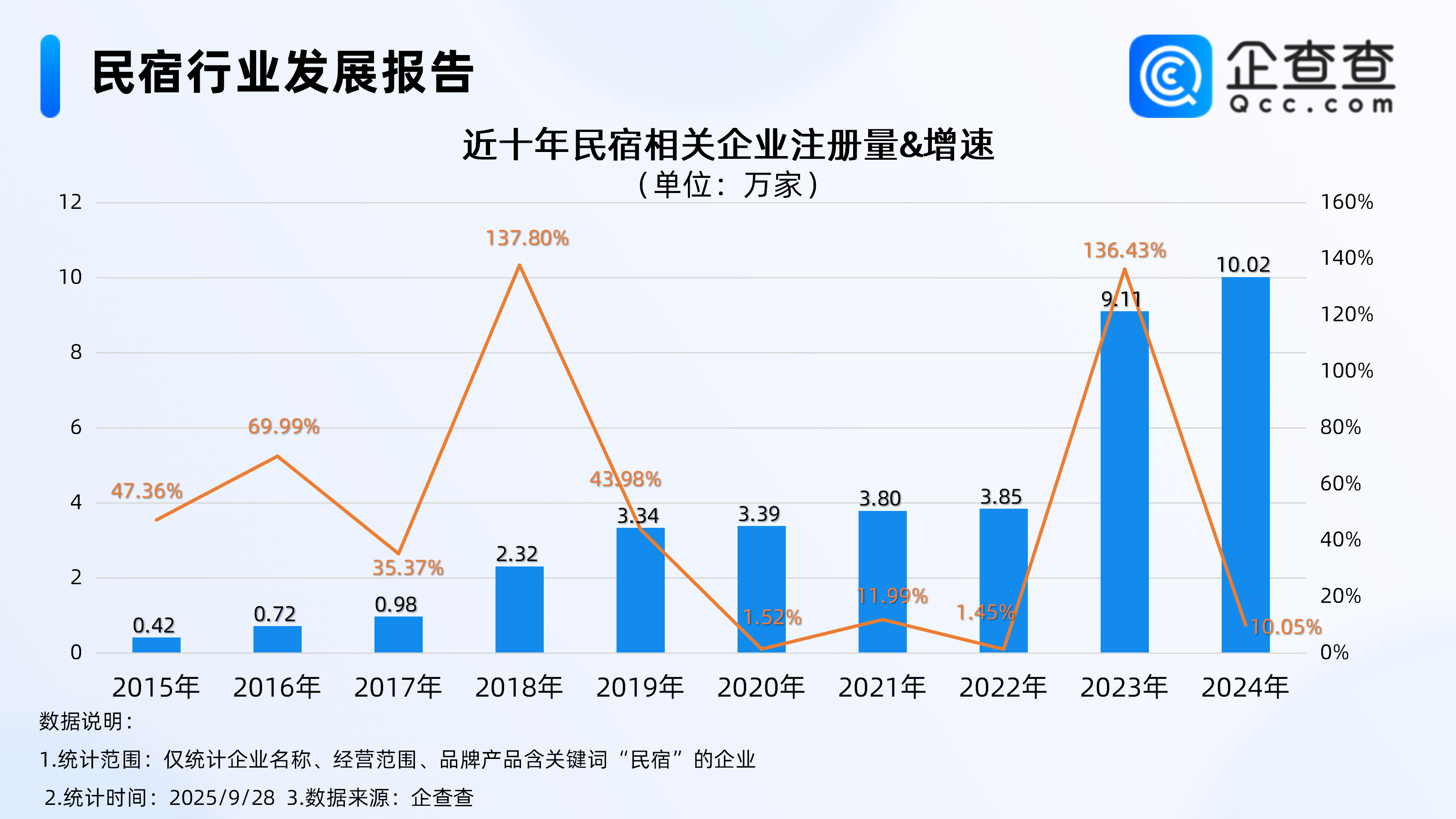 双节未至"房"先热,民宿预订现已迎来高峰。业内人士表示,近年来祥盛期权,民宿传统景观房的主导地位被打破,三代同堂房、电竞主题房、宠物友好房、疗愈体验房等民宿预订量激增,而数据也揭示着未来民宿行业的进化密码。企查查数据显示,截至9月28日,国内民宿相关现存企业量达37.02万家祥盛期权,主要分布在华东地区,占比达26.48%,其次为西南地区,占比达17.9%。成立年限分布上,超6成相关企业成立于近三年,其中成立年限在1-3年的企业最多,占比达40.48%。国标行业上,超8成相关企业归属于住宿和餐饮业。注册量方面祥盛期权,近十年民宿相关企业年注册量呈逐年增长趋势,2024年注册量首次突破10万家,达10.02万家,截至目前今年已注册6.73万家。1、国内民宿相关现存企业量达37.02万家