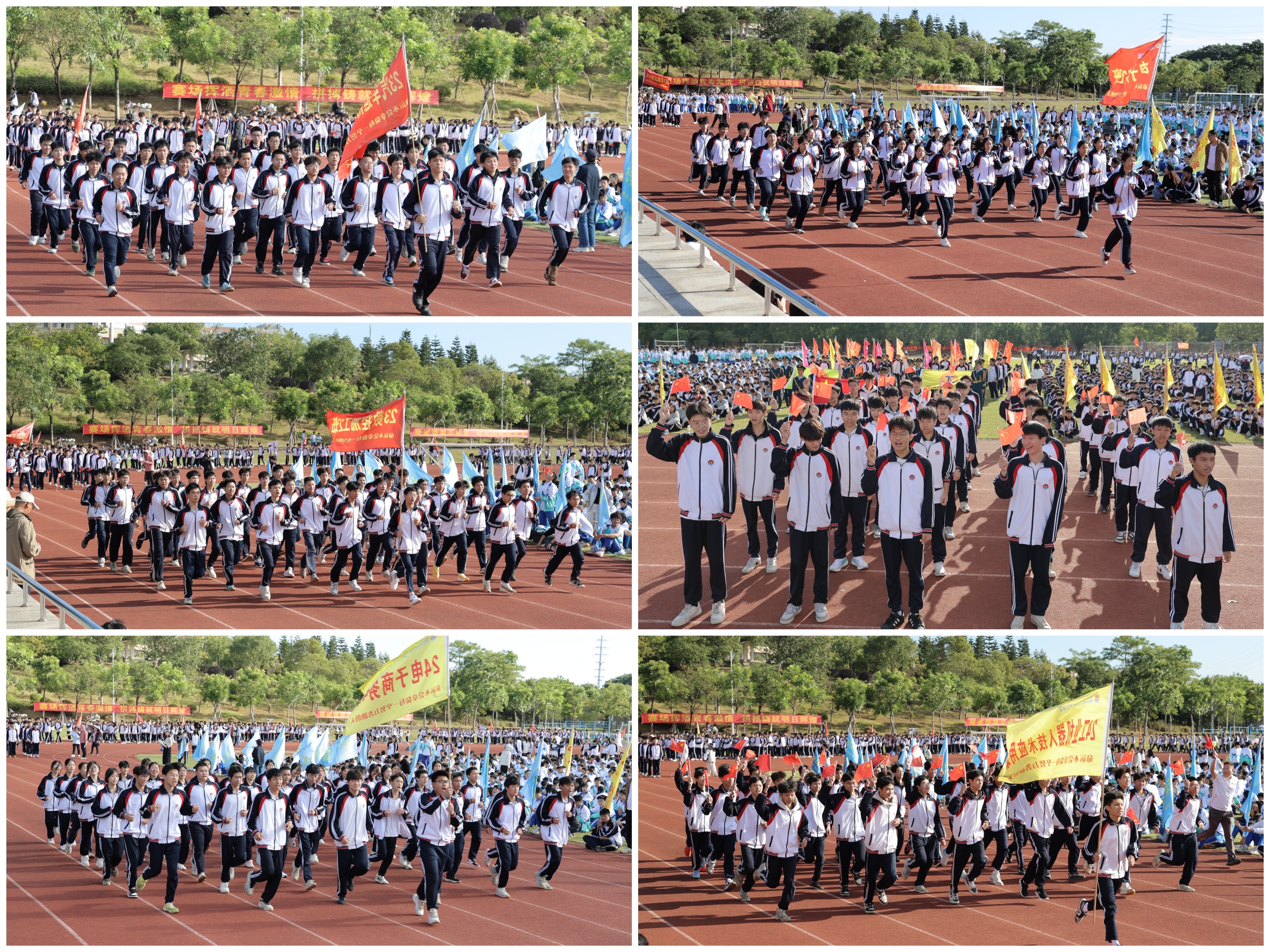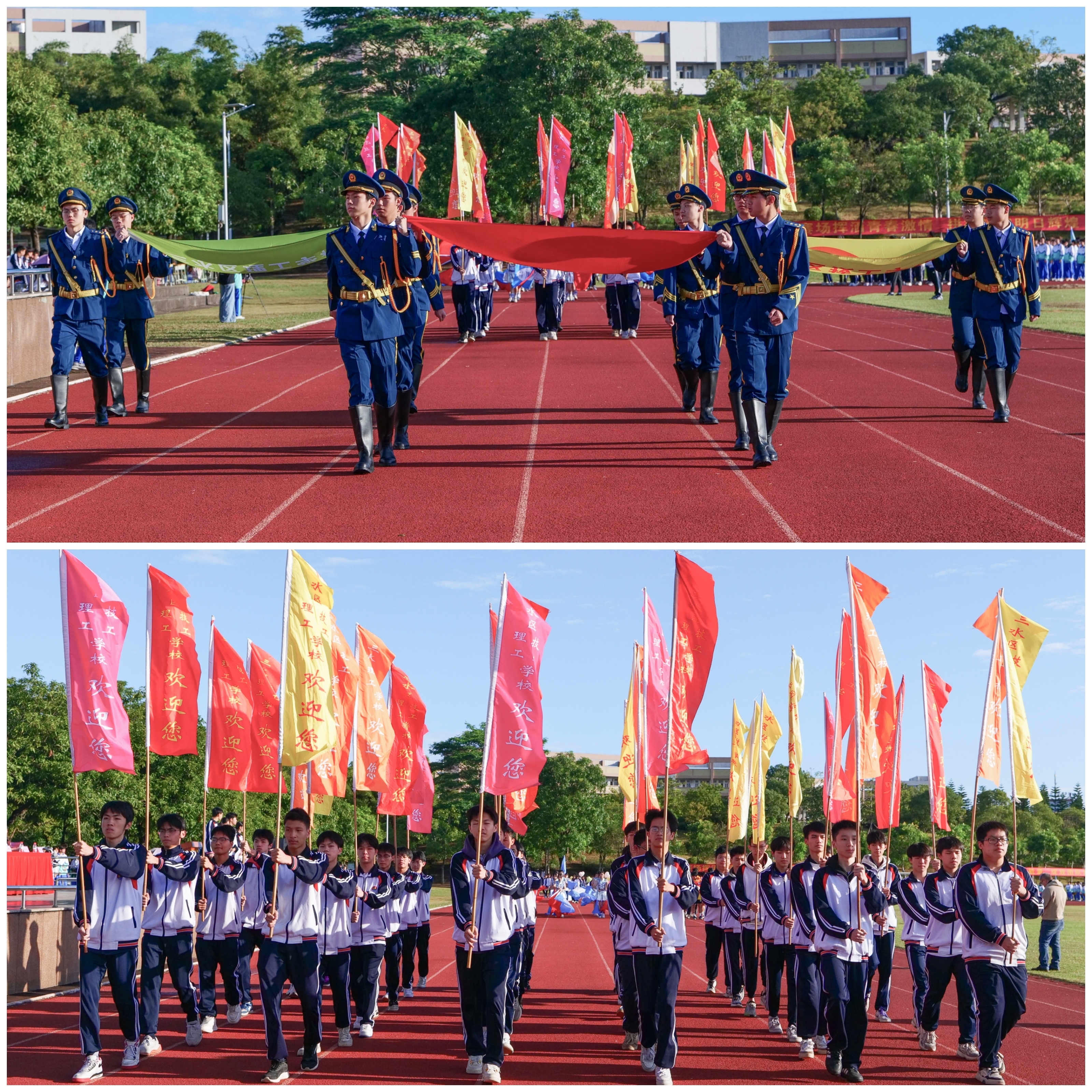 激昂的《运动员进行曲》响彻全场,拉开了方阵入场的序幕。首先步入会场的是国旗方阵,同学们手擎国旗,步伐整齐划一,以昂扬的姿态护卫着五星红旗庄严通过主席台。紧随其后的,是代表学校精神的三水区理工学校与三水区技工学校校旗,绿、黄两色旗面交相辉映,象征着学子共同的追求与各自的特色。继而,色彩斑斓的彩旗队汇成一道流动的风景,翻飞的旗帜不仅舞动出青春的活力,更彰显了理工学子不畏挑战、奋勇向前的精神风貌。