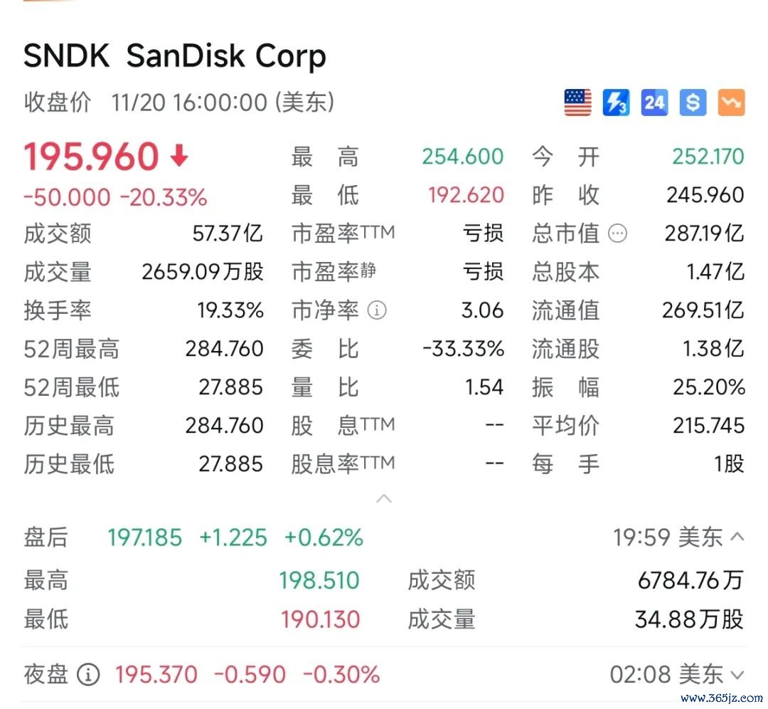 尽管AI热潮正引发全球内存短缺危机奕汇网,但存储大厂闪迪(Sandisk)昨夜依然遭遇了股价的大幅下跌。