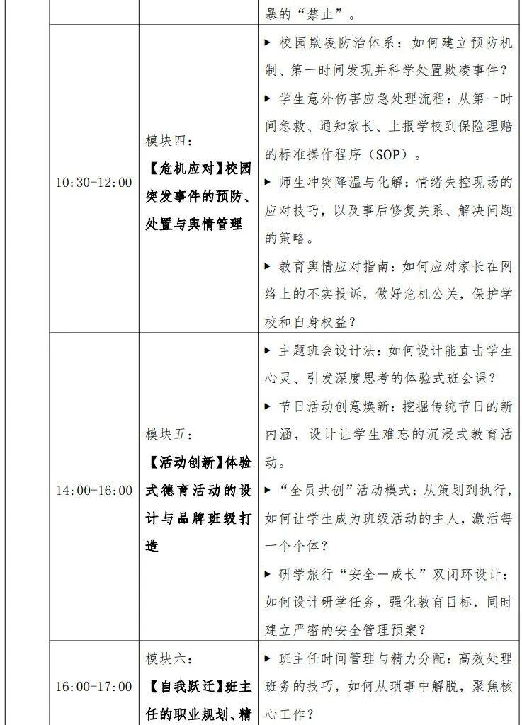 本项目精心设计六大核心模块,内容贯穿班主任工作的“内功修炼”与“外功施展”,致力于打造“预防-干预-发展”的全周期赋能体系。