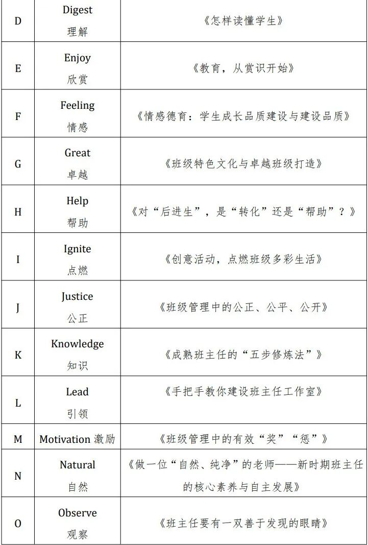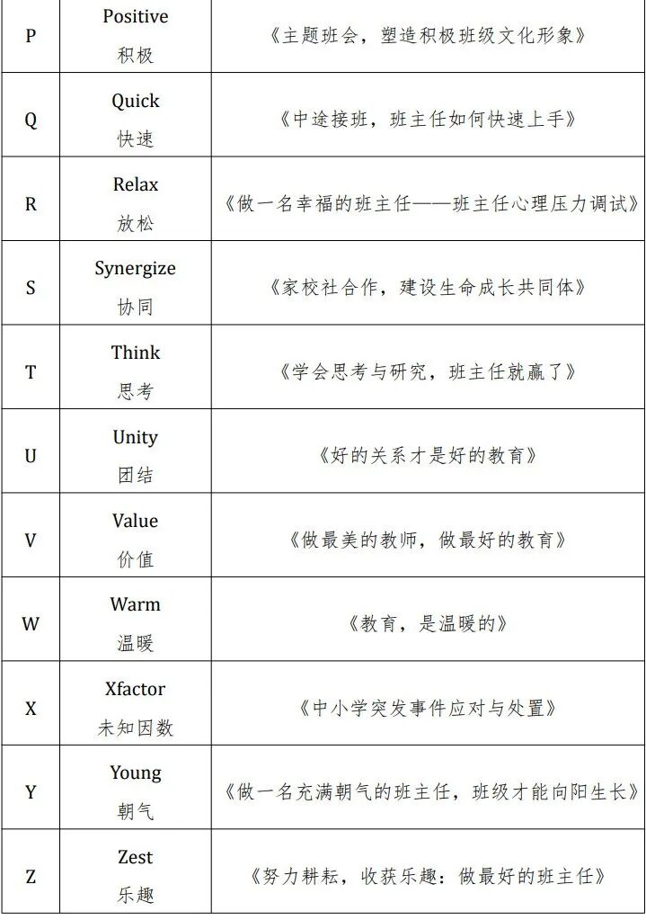 班主任主题线上课程精准聚焦班主任职业成长全需求,以26个英文字母为索引构建系统化体系,涵盖职业信念塑造、师生沟通技巧、班级管理实务、家校协同策略、应急处置方法及个人素养提升等核心维度,贯穿新手入门、成熟进阶至价值升华全周期。课程汇聚全国德育研究专家、特级教师、名校长等顶尖师资,兼具理论深度与实践指导性,每节内容均以“理念阐释+案例佐证+实操工具”呈现,破解班级管理痛点与碎片化学习难题。通过系统学习,可快速夯实专业能力、优化管理效能,助力班主任实现职业能力与教育价值的双重提升,是班主任专业成长的优质进阶路径。具体主题如下: