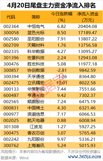 个股方面,中恒电气尾盘主力资金净流入金额超2亿元,蓝色光标、圣阳股份、天赐材料、科华数据、宏景科技、胜宏科技尾盘主力资金净流入金额均超1亿元。