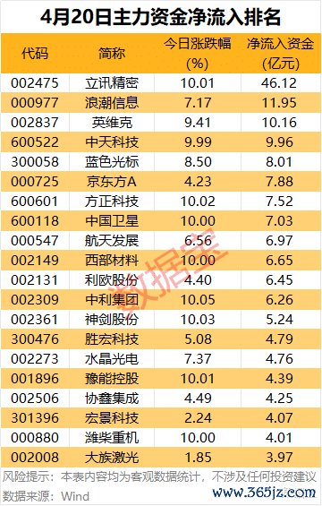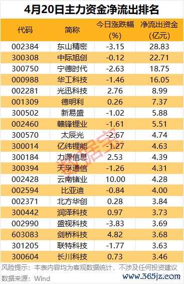 20个行业主力资金净流出,通信、基础化工行业主力资金净流出金额分别为50.51亿元、21.17亿元;有色金属、电力设备、医药生物行业主力资金净流出金额均超10亿元。