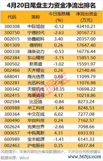 尾盘主力资金净流出方面,中际旭创、宁德时代、协鑫能科尾盘主力资金净流出均超2亿元,德明利、潍柴动力、东山精密、新易盛等个股主力资金净流出金额均超1亿元。