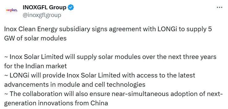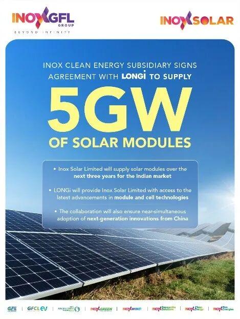 隆基绿能是中国的一家全球性太阳能科技公司,Inox Solar是印度本土光伏制造企业,隶属于Inox GFL集团。