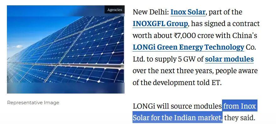 近期,国内外社交平台流传“中国太阳能要从印度进口产能”“出现罕见的角色转换”的消息,并转载报道称,“中国的隆基绿能将向印企Inox Solar采购价值700亿卢比的总计500万千瓦时的组件,订单为期三年。”