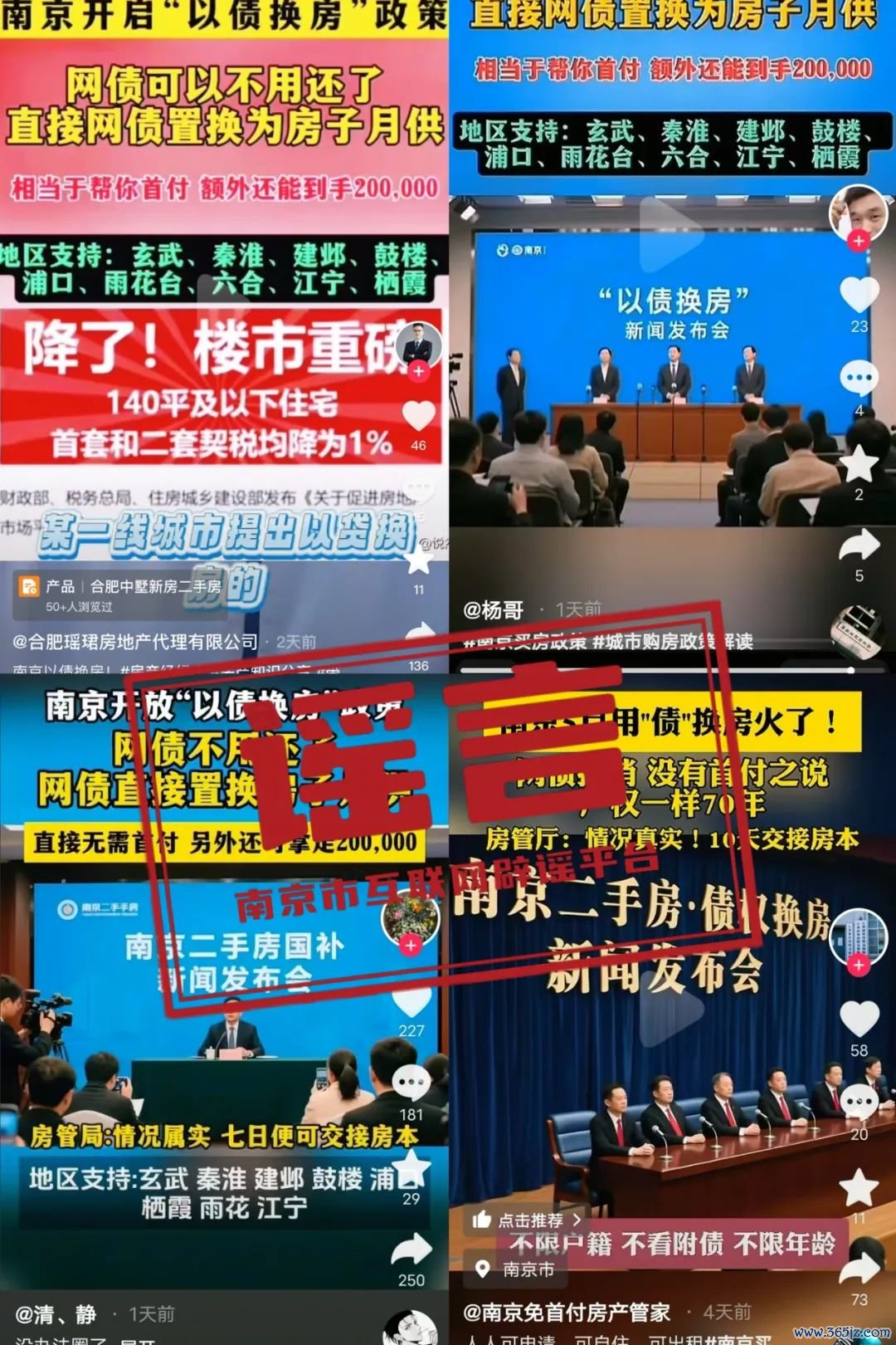 “南京网络辟谣”微信公众号6月1日晚消息,近日,有“南京二手房零首付李经理”“合肥瑶珺房地产代理有限公司”“中墅地产唐广君”“清、静”“杨哥”“南京免首付房产管家”等账号发帖称郑州配资网,南京开放“以债换房”政策,网债不用还,可直接置换房子月供,没有首付之说。
